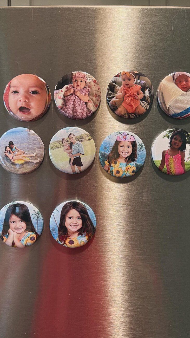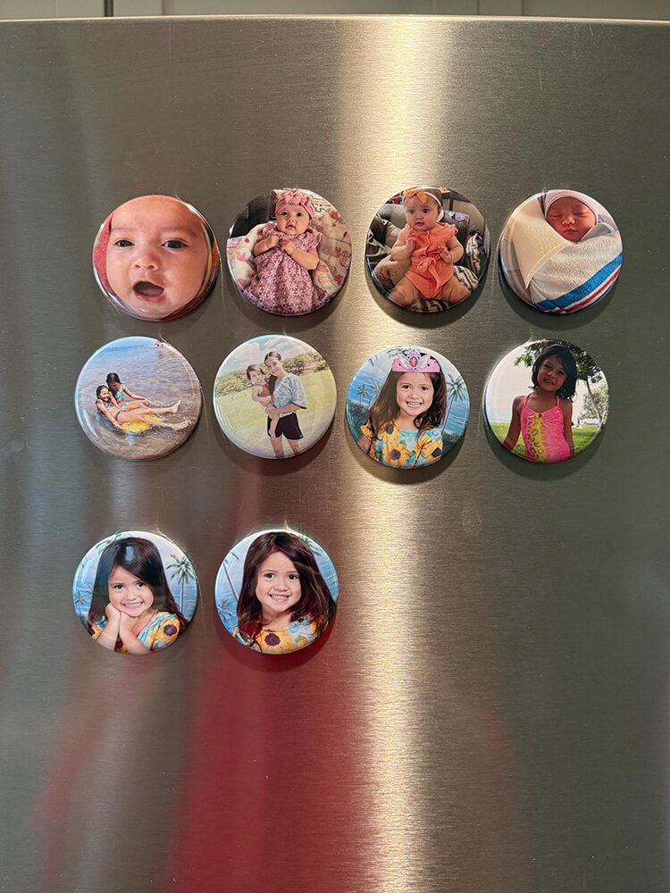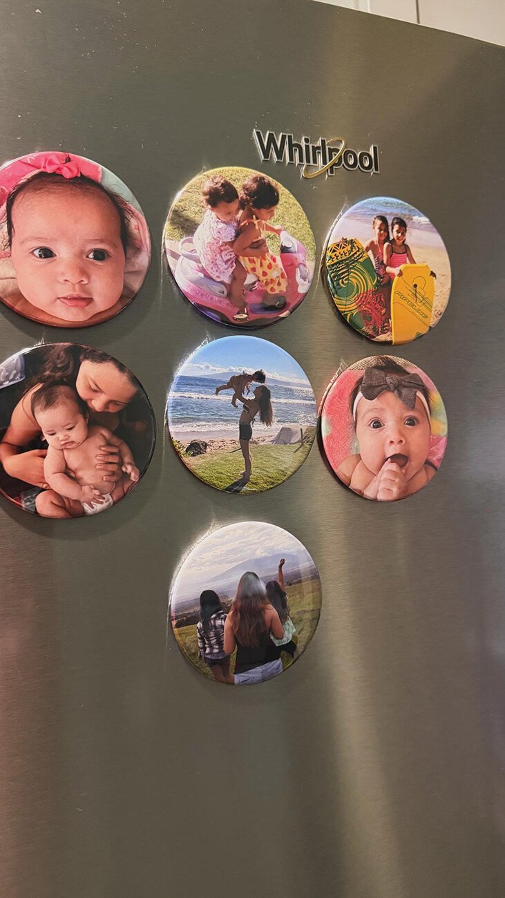 Our custom photo magnets are crafted with care and quality in mind. Each magnet is printed on premium glossy photo paper to ensure vibrant, high-resolution images, then pressed using a professional button maker for a clean, durable finish.